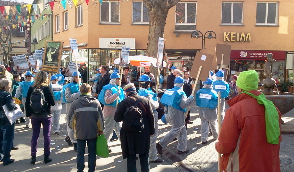 Viele waren da! BUNT und SCHRILL gekleidete Menschen sowie die Gruppen Capella Rebella und Songwriter, eine Theatergruppe und die Gruppe ZugumZug mit ihrer Aktion „Stuttgart Verrohrt“. Sonnig und mit guter Stimmung wurde mit einem Umzug durch die Marktstraße Bad Cannstatt unsicher gemacht.