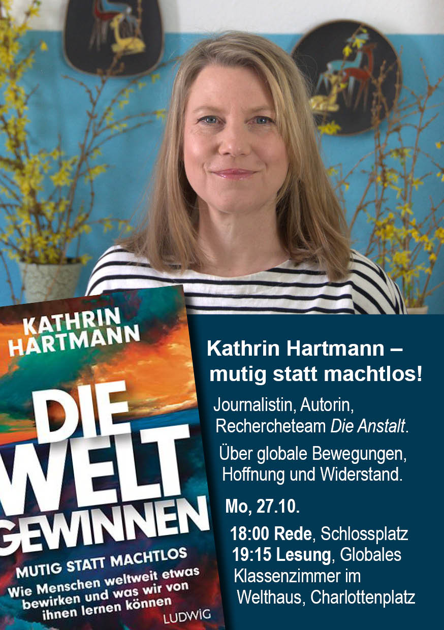 - Montag, 27.10,. 19:15: Lesung und Gespräch mit Kathrin Hartmann (Globales Klassenzimmer im Welthaus, Charlottenplatz)