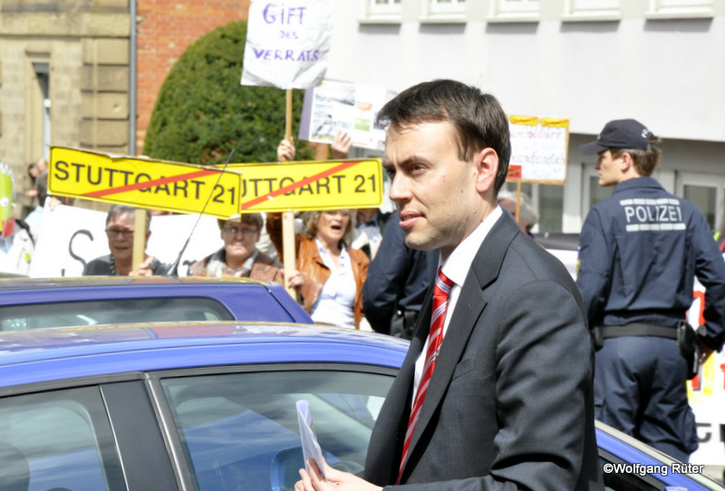 Heute hat die grün-rote Landesregierung sich und ihren vor einem Jahr unterschriebenen Koalitionsvertrag gefeiert. Vor das Haus der Architekten in der Danneckerstr. 54 kamen spontan etwa 50 S21-Gegner, nachdem wir hier bei BAA gestern über den Termin berichtet hatten.