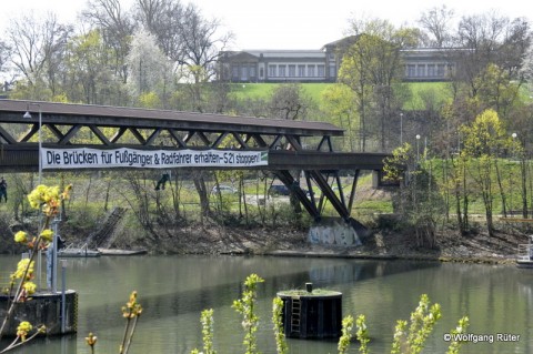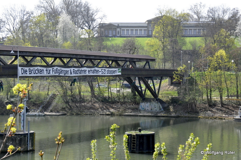 Mit dieser Forderung entrollten am Sonntag, 30. März, Robin-Wood-Aktivisten direkt vom Holzsteg über dem Neckar ein weithin sichtbares Banner. Der Zeitpunkt dieser Aktion konnte nicht besser sein, denn bei herrlichem Wetter und Sonnenschein waren Tausende Fußgänger und Radfahrer auf dem Weg zur Wilhelma und in den Rosensteinpark. Sie nutzten dabei selbstverständlich - wie könnte es anders sein - den für viel Geld restaurierten Holzsteg, den die Bahn für das umstrittene Projekt Stuttgart 21 in Kürze, ebenso wie den Elefantensteg abreißen lassen will.
