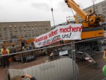 Ende Juli 2013 hatte es in den Stuttgarter Wagenhallen das „3. Europäische Forum gegen unnütze, aufgezwungene Großprojekte“ gegeben. An die 2000 TeilnehmerInnen kamen aus Ländern, in denen technische Großprojekte geplant sind oder bereits errichtet wurden, die keinen wirtschaftlichen Nutzen bringen, sondern nur sozialen und ökologischen Schaden anrichten. Initiativen waren aus Frankreich, Italien, England, Spanien, Belgien, der Türkei und Indien gekommen. Deutsche Gruppen hatten den Flughafenausbau in Frankfurt, die Fracking-Versuche in Niedersachesen, die Fehmarn-Belt-Überquerung und natürlich Stuttgart 21 als Themen. Es gab Vorträge, Diskussionen und Workshops. Am besagten Montag, 29. Juli 2013, fand dann eine gemeinsame internationale Demonstration mit Blockade am Technikgebäude am ehemaligen Nordflügel statt. Hier die Fotos von W. Rüter: